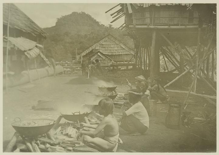 View Original:KITLV - 25700 - Demmeni, J. - Cooking the meal for the big parties in the building of the great house of Kwing Irang, head of Kayan on the Upper Mahakam, Central Borneo. The iron pans are completely filled with chopped pork - 1898-1900.tif.tiff (2005x1426)