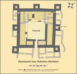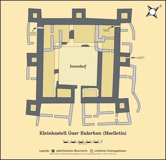 | Keywords: Kleinkastell Gasr Bularkan.svg de Das Kleinkastell Gasr Bularkan das zunĂ€chst als small Roman fort at Mselletin römisches Kleinkastell bei Mselletin durch seinen Entdecker den ArchĂ€ologen Richard G Goodchild 1918 1968 bekannt wurde ist ein ehemaliges spĂ€trömisches MilitĂ€rlager dessen Besatzung fĂŒr Sicherungs- und Ă berwachungsaufgaben im Hinterland des Limes Tripolitanus zustĂ€ndig war Die Reste des guterhaltenen Garnisonsorts befinden sich nahe der am Wadi Merdum vorbeifĂŒhrenden StraĂe rund 40 Kilometer nordöstlich der Stadt Beni Ulid die in Libyen im Munizip Misrata liegt Quelle Richard G Goodchild The Limes Tripolitanus II In The Journal of Roman Studies 40 1950 S 30 38 Fig 4 own Mediatus 2014-06-13 v Cc-zero Limes Tripolitanus |