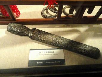 Keywords: Knife - Yunnan Nationalities Museum - DSC04073.JPG Achang silver sword sheath Jewelry in the Yunnan Nationalities Museum Kunming Yunnan China I took this photograph 2011-08-13 01 36 08 Daderot Public domain Jewellery in the Yunnan Nationalities Museum Achang jewelry |