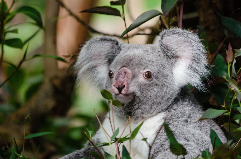 Keywords: koala bear tree sitting perched portrait grey fur wildlife nature looking cuddly mammal cute