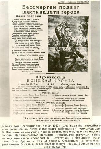 Keywords: Kochetkov leaflet.jpg ru Ф онтовая листовка посвящённая подвигу В Д Кочеткову и его подчинённым Листовка издана в 1942 году во в емя Сталинг адской битвы 2014-10-16 11 09 59 http //www penza-km ru/ Пензенский областной к аеведческий музей файл п едоставил ди екто музея Зименков В author файл п едоставил ди екто музея Зименков В для азмещения в википедии other versions Custom license marker 2014 10 16 PD-Russia Uploaded with UploadWizard Battle of Stalingrad People associated with World War II from the Soviet Union Kochetkov Vasily Dmitrievich |