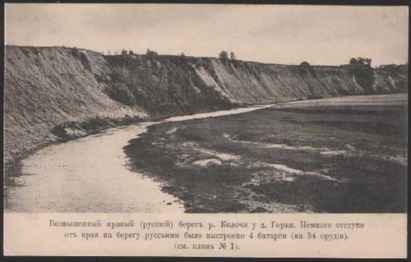 | Keywords: Koloch River old postcard.jpg en Old Russian postcard printed by Sherer Nabgoltz Co Moscow before 1917 and showing 'The high right Russian shore of the Koloch River near the village of Gorki A little away from the edge on the shore the Russians built 4 batteries for 34 guns See Scheme 1 ' ru Ста ая усская отк ытка напечатанная Фототипия Ше е абгольц и Ко осква до 1917 года и изоб ажающая Возвышенный п авый усский бе ег Колочи у д Го ки емного отступя от к ая на бе егу усскими было выст оено 4 бата еи на 34 о удия См план 1 http //www uvarovka ru/gallery html mode view_foto cat 18 podcat 105 Uknown; postcard printed by Sherer Nabgoltz Co Moscow before 1917 Template PD-RusEmpire PD-RusEmpire Koloch 1910s postcards Scherer and Nabholz Gorki Borodino rural settlement |