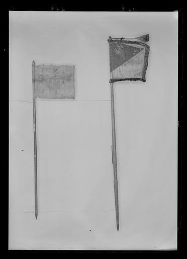 Keywords: Kompanistandar för Västgöta tre- och femmänningar, under översten greve Gustav Fredrik Lewenhaupt - Livrustkammaren - 68890.tif Förfärdigat efter Karl XII s förordning den 2 aug 1700 Duk enkel av damast gul och svart ganska trasig skarvad nedtill horisontellt Dekor diagonalt delad i två fält det övre inre svart det nedre yttre gult; i inre hörnet målat omvänt lika på båda sidor ett upprätt lejon övre halvan i brunskuggat guld nedre i mörkgrått följt av två stjärnor i svartskuggat silver Västergötlands vapen Frans dubbel i svart och gult silke fäst vid stången med tre rader tennlickor på svarta och gula band Stång av trä kannelerad; holk av mässing; doppsko av läder fastsydd <br/><br/> 4 <br/>Katalogisering Rebecka Enhörning 1976-10-05 inmatning-utskrift PAr 1996-11-06 <br/><br/>Deposition till Armémuseum januari 1997 <br/><br/>Litteratur <br/>Cederström R Svenska kungliga hufvudbanér Stockholm 1900 nr 66 original caption 1700-08-02 silk Färg svart gul material silke - wood - brass size mm 45 skarv size mm 190 lejon size mm 540 size mm 460 size mm 2910 stång size mm 62 frans LRK place of origin original filename LN_B01168_004048 53343 inventory number LRK 16777 68890 CC0 Kompanistandar för Västgöta tre- och femmänningar under översten greve Gustav Fredrik Lewenhaupt - Livrustkammaren - 68890-negative tif <gallery caption Different images of same object > File Kompanistandar för Västgöta tre- och femmänningar under översten greve Gustav Fredrik Lewenhaupt - Livrustkammaren - 43208 tif File Kompanistandar för Västgöta tre- och femmänningar under översten greve Gustav Fredrik Lewenhaupt - Livrustkammaren - 1197 tif </gallery> Heraldic flags Media contributed by LSH dim-with multiple size templates Flags in the Livrustkammaren Media contributed by LSH 2013-10