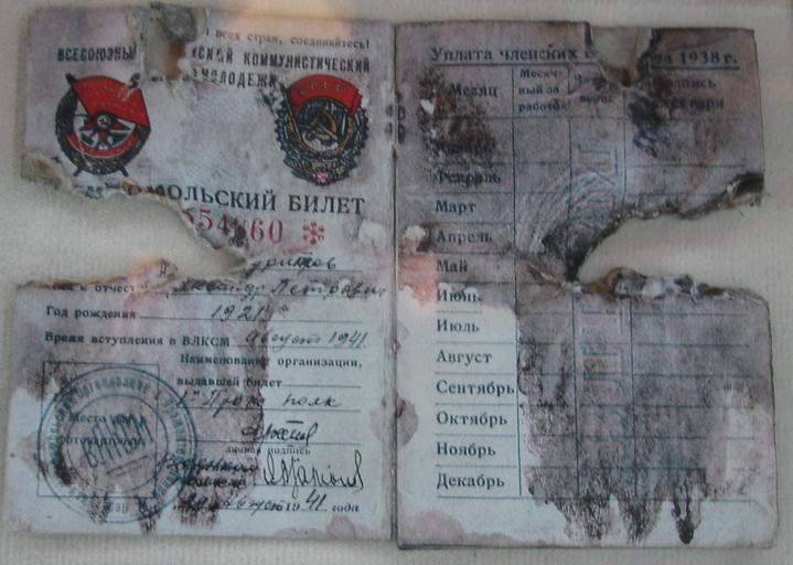 Keywords: Komsomol membership card.jpg en The Komsomol membership card of the soldier of the Soviet army shot by a bullet ru П ост еленный комсомольский билет воина Советской а мии защищавшего Ленинг ад фото сделано в памятном зале онумента ге оическим защитникам Ленинг ада Санкт-Пете бу г площадь Победы 2007 1941 User Ajvol PD-RU-exempt Komsomol Membership cards of Komsomol |