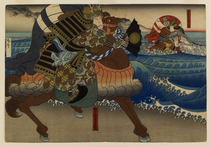 | Keywords: Konishi Hirosada - Naozane's Challenge - Walters 95714.jpg  The victorious Genji general Kumagai Naozane spies a defeated Heike warrior Taira no Atsumori heading on horseback into the sea where he is hoping to make it to his clan's fleet anchored offshore It is cowardly to turn your back on your enemy Naozane cries beckoning with his fan come back Atsumori returns to fight and Naozane beheads him But it is a tragic episode for Atsumori is but a youth and at dawn before the battle began his flute playing had been heard by all 四代目中 歌右衛 の熊谷次郎直実  代中 福助の無官太夫あつ盛  (嘉永3年(1850年)5  大 中の 居上演   谷嫩軍記 より ) s 1850 late Edo mulberry paper color ink cm 25 4 36 83 accession number 95 714 19345 Robert S Shaull date and mode of acquisition unknown Walters Art Museum Henry Walters Bequest of Robert S Shaull 1990 Signature Hirosada place of origin Osaka Japan Walters Art Museum license 2D ImageNote 1 286 11 950 1018 1800 1261 2 Nakamura Utaemon IV as Kumagai Naozane ImageNoteEnd 1 ImageNote 2 1224 110 461 374 1800 1261 2 Nakamura Fukusuke I as Taira no Atsumori ImageNoteEnd 2 Horo Japanese prints in the Walters Art Museum Kumagai Naozane Taira no Atsumori Utaemon Nakamura IV Shikan Nakamura IV Ukiyo-e of Ichinotani Futaba Gunki Historic samurai prints Konishi Hirosada Historic depictions of samurai on horses |