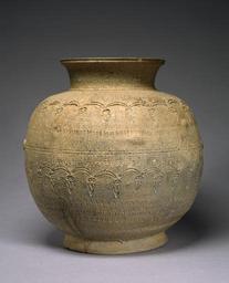 | Keywords: Korean - Stamped Jar - Walters 492764 - Profile.jpg The jar is of spherical form supported on a splayed foot and surmounted by a high flared neck Two thin scrolled coils are applied opposite each other at the midsection pressed with enough force to make a slight indentation Two stamped rows of scalloped borders and cicada-like motifs with heart-shaped bodies enclosing multi dot bands encircle the body A series of zig-zag crescent and line border are stamped and carved above the foot The neck is stamped with trailing trefoil motifs above radiating lines of multi-dots on the shoulder Some of the stamped jars that have been found in tombs were used as urns in accordance with the Buddhist preference for cremation Buddhism had become the official religion of the Silla period in 528 century 8 9 Unified Silla stoneware cm 23 5 23 diam accession number 49 2764 18163 Alice Boney New York date and mode of acquisition unknown Unknown family upstate New York by purchase ca 1950 - 1959 Kaikodo Asian Art Gallery New York NY Carol Conover Kaikodo NY 1997 by purchase Friends of the Asian Collection by purchase Walters Art Museum Gift of the Friends of the Asian Collection 1999 place of origin Korea Walters Art Museum license Art of Korea in the Walters Art Museum Art of Korea Media contributed by the Walters Art Museum needs category review |