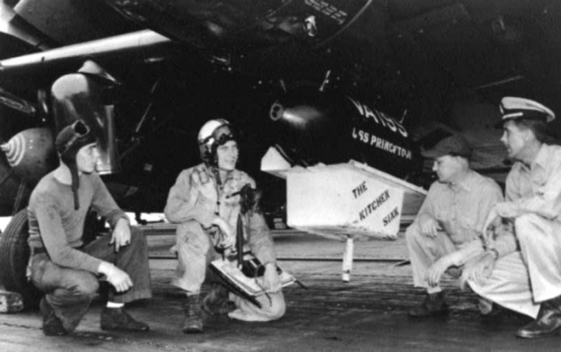 | Keywords: Korean War KitchenSinkBomb USS Princeton (CV-37) 1952.jpg en U S Navy Ltjg Carl B Austin 2nd from left below his Douglas AD-4 Skyraider of attack squadron VA-195 Dambusters with a special ordnance aboard the aircraft carrier USS Princeton CVA-37 in August 1952 VA-195 was assigned to Carrier Air Group 19 CVG-19 for a deployment to the Korean War from 21 March to 3 November 1952 The special weapon was a 454 kg 1000 lb bomb with a kitchen sink attached The idea came up when the squadron's executive officer LCdr M K Dennis remarked during a meeting with the press We dropped everything on them the North Koreans but a kitchen sink Royal J Deland ADC and J Burnett ADC then produced a bomb with a kitchen sink attached The commanding Admiral was not pleased by this and would not allow to drop the bomb for a week However press coverage in the United States obviously led to the dropping of this bomb in August 1952 on Pyongyang by Lt jg Carl B Austin http //138 147 50 20/a-korea/dec52-12 pdf U S Navy Naval Aviation News May-June 2001 http //www history navy mil/nan/backissues/2000s/2001/mj01/korea pdf U S Navy 1952-08 PD-USGov-Military-Navy AD-4 Skyraider Korean War in 1952 Aboard USS Princeton CV-37 Strike Fighter Squadron 195 United States Navy |