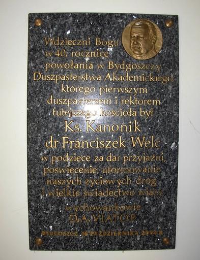 | Keywords: Kościół klarysek B - tablica 2.jpg pl Tablica upamiętniająca ks Franciszka Welca - pierwszego rektora i duszpasterza akademickiego w kościele klarysek own Pit1233 2011 Cc-zero Interior of the Assumption church in Bydgoszcz Plaques in Bydgoszcz |
