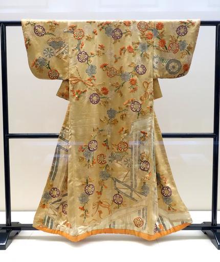 | View Original: | Kosode (garment with small wrist openings), Edo period, 18th century, fence, cherry, chrysanthemum and flower cart design on saffron figured satin ground - Tokyo National Museum - DSC06206.JPG (3562x4238) | |||