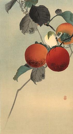 Keywords: Koson Vogel und Kaki.jpg en Bird and persimmon fruit 1900-1910 Catalogue Ohara Koson other versions Custom license marker 2016 01 19 PD-Japan Ohara Koson Diospyros in art