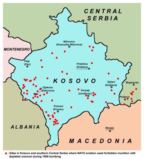 | Keywords: Kosovo uranium NATO bombing1999.png en Sites in Kosovo and southern Central Serbia where NATO aviation used depleted uranium rounds during 1999 bombing sr Локације на Косову и југу Цент алне С бије на којима је АТО авијација ко истила заб ањену муницију са оси омашеним у анијумом током бомба довања 1999 године own PANONIAN 2010 References http //www jacksonprogressive com/issues/kosovo/chossudovsky_lowintensity html http //www jacksonprogressive com/issues/kosovo/targeted gif http //mondediplo com/IMG/arton2045 gif http //www journal forces gc ca/vo4/no1/research-recherch-eng asp http //kosova org/pics/maps/dukosom gif http //www srpskapolitika com/Nato/nato-genocid html http //www spc rs/sr/tajne_oruzja_sa_osiromasenim_uranijumom Večernje Novosti Utorak 18 maj 2010 strana 5 Maps of the history of Kosovo in modern times Maps of the history of Serbia in modern times Maps of the Yugoslav wars Kosovo War 1999 NATO bombing of Yugoslavia War crimes Depleted uranium English language maps of Europe |
