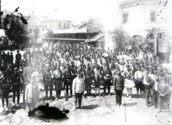 Keywords: Kosturski garnizon privrzanici na Mladoturskata revolucija.jpg mk Косту скиот га низон на чело со уфта бег п виот од десно во п виот ед п и доаѓањето во Битола за в еме на ладоту ската еволуција Битола 1908 оштетена плоча en Kostur garrison headed by Myftari Bey first from right in front row on the arrival in Bitola during the Young Turk revolution Bitola 1908 Damaged glass plate DARM archive 1908 The State Archives of the Republic of Macedonia DARM Bitola Department Creator Yanaki and Milton Manaki other versions Custom license marker 2016 09 26 PD-Macedonia Wikipedian in Residence at DARM Photographs by Manaki Brothers Young Turk Revolution |