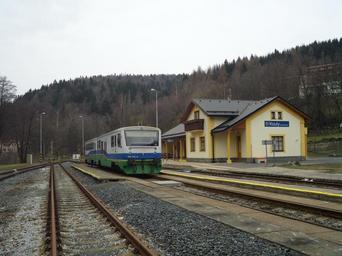 Keywords: Kouty nad Desnou station.JPG Kouty nad Desnou Czech Republic 2012-04-05 own Jan Pešula cc-zero Uploaded with UploadWizard Kouty nad Desnou train station CZ Class 814 of Železnice Desná