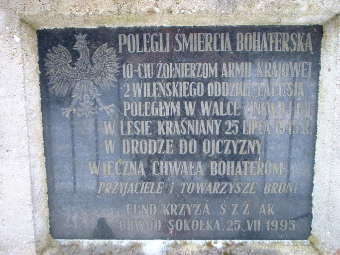 Keywords: Krasniany-las-pomnik-napis2.jpg pl Tablica na pomniku żołnierzy AK poległych w lesie w pobliżu Kraśnian Own Rhn mk1 100px100px Kraśniany War memorials in Poland