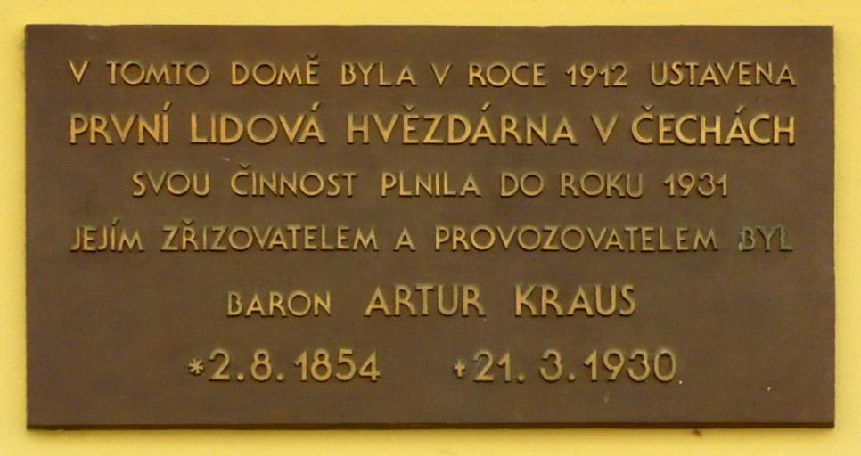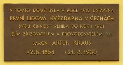 | Keywords: Kraus plaque Pardubice.jpg  en Memorial plaque of Artur Kraus´ astronomical observatory Pardubice Třída míru č p 62 cs Pamětní deska na domě č p 62 kde v letech 1912-1931 provozoval svou Lidovou hvězdárnu baron Artur Kraus own Gampe 2011-07-06 Plaques in Pardubice Artur Kraus Třída Míru Pardubice  |