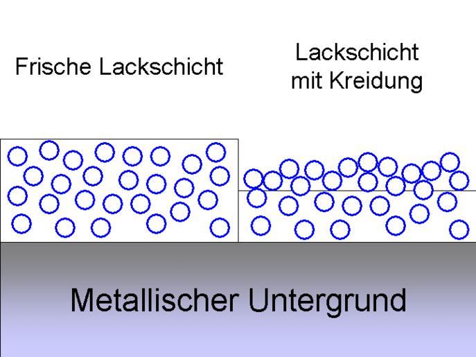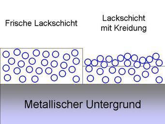 | Keywords: Kreidung Schema.gif  en The chart shows how a coating layer is altered if chalking occurs On the left side can be seen how the layer looks immediately after application / hardening The right side shows how pigment particles blue are lying on the surface after the resin has been degraded de In der Darstellung wird gezeigt wie eine frische Lackschicht links im Vergleich zu einer gekreideten Lackschicht rechts aussieht Auf der rechten Seite ist klar zu erkennen wie die Pigmentpartikel blau nach dem Abbau des Bindemittels frei auf der Lackoberfläche liegen own Hardcoreraveman 2009-07-15 Paint defect Pigments Weathering diagrams |