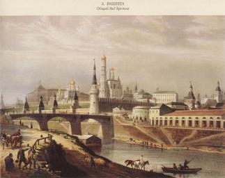 | Keywords: Kreml 19vek.jpg A general view of the Kremlin Общий вид К емля http //grigorius narod ru/rusmoscowpict htm century 19 L Biсheboi PD-Old Moscow Kremlin in art Bolshoy Moskvoretsky Bridge Historical images of Zaryadye Historical images of Moscow Kremlin |