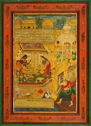 | Keywords: Krishna Has the Doors of Dwarka Shut on the Hungry Bhima.jpg en Paint on wood 38 x 27 5 cm Collection Horniman Museum and Gardens Krishna figure in dark blue has the doors of Dwarka shut on the hungry Bhima Scene from 'The Mahabharata' At bottom right of the painting Bhima beats at the gate Three women below left carry vessels and a man in front of them remonstrates with the visitor The semi-aerial perspective allows the viewer to see inside the walls two women setting out dishes on a table under a canopy with other vessels arranged on the tesselated floor In the background on the right another woman kneels inside a circular white pavilion There are two inscriptions one in a rectangular panel above the canopy another in a rectangular panel to bottom left The whole surrounded by a border in pink decorated with alternating flower and bird motifs The text in late 19th-century Urdu written in a cursive nasta'liq-e khafi hand refers to the painting as 'Number 82' or 'Number 84 ' The painting also dates from the late 19th century probably from the art schools of Jaipur India and adapts a composition from the dispersed late 16th-century 'Jaipur' Razmnamah manuscript in the Jaipur royal collection Maharaja Sawai Man Singh II Museum and British Library an illustrated Persian translation from the original Sanskrit version by Naqib Khan created at the court of the 3rd Mogul Emperor Akbar I d 1605 century 19 http //www bbc co uk/arts/yourpaintings/paintings/at-the-palace-gate-194093 author PD-Art Uploaded with UploadWizard Mahabharata |