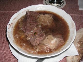 Keywords: Kronfleisch 5.jpg Kronfleisch skirt steak served in hot broth with onion rings Own 2007-08-07 Alcibiades Kronfleisch