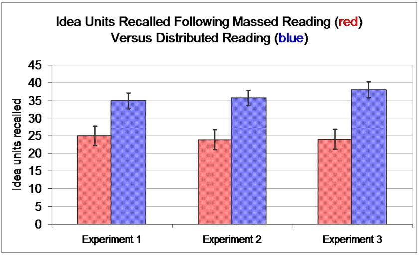 MAKE A MEME View Large Image KrugDavisGlover1990.png This image shows results from a series of three experiments on massed versus distributed reading reported by Krug Davis and Glover 1990 The red bars show the mean idea units recalled by groups who read a passage ...