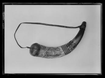 Keywords: Kruthorn - Livrustkammaren - 43274.tif Kruthorn av oxhorn utskurna bilder runt om föreställande ett skepp kravell under segel latinmesan och storsegel beslagna på stormasten flagga med horn på fock-- och mesanmasten tredelade flaggor Till h därom upptill lejon med sabel därnedan-för sköld med på hake hängande horn sköldhållare enhörning Till h därom kanon och luntlåsmusköt Vid fartygets akter sköld krönt av krona däri skrivet med bläck senare tillfogat Clac « Horn R Ani rul därunder inskuret årtalet 1546 På mitten av hornet tre utskurna sicksackränder och två tandade kantlinjer Ovanför ränderna en åttkantig dekor med djupa nedskärningar Graverad vågbands-linje längs bottenkanten Välvd bottenplatta av trä med utskuren dekor med åtta blad i mitten en remögla Spetsen är blyskodd <br/><br/>Tillbehör <br/>Bärrem i skinn bunden runt pip och genom bottenplattans ögla original caption kruthorn - LRK 3149 1546 g 410 size mm 330 74 LRK place of origin SE original filename LN_B01835_004715 39735 inventory number LRK 3149 43274 CC0 Kruthorn - Livrustkammaren - 43274-negative tif Powder horns Media contributed by LSH unmatched objKeyword Media contributed by LSH 2013-10