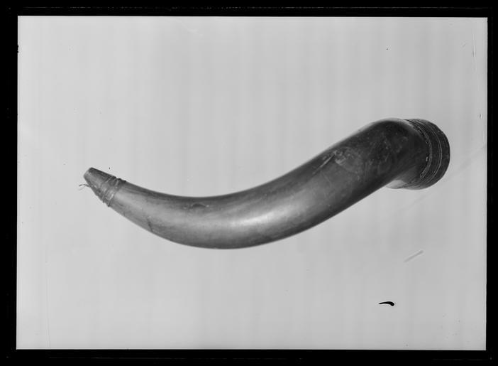 Keywords: Kruthorn - Livrustkammaren - 68857.tif Stort vridet grönbrunt kruthorn av uroxhorn med genombrutet beslag av bly över den spetsiga änden På ena sidan genomborrat hål i beslaget Kort brun bärrem av läder knuten genom hålet Tjocka änden förlängd med en svarvad botten av masur l 90 mm vars öppning tillslutes med en svarvad masurpropp med bred bas och rund knopp Bottnen fäst vid hornet med tolv träpluggar På masurbottnens ena sida inbränt ett bomärke original caption kruthorn - LRK 3220 other date century 16 leather e0 material läder - horn - lead e0 material bly g 1050 size mm 116 581 LRK Gunnar Olof Hyltén-Cavallius doktor Jakt 1973 Läckö slott place of origin original filename LN_B00838_003718 39797 inventory number LRK 3220 68857 CC0 Kruthorn - Livrustkammaren - 68857-negative tif <gallery caption Different images of same object > File Kruthorn - Livrustkammaren - 44206 tif File Kruthorn - Livrustkammaren - 34638 tif </gallery> Media contributed by LSH unmatched material Media contributed by LSH unmatched objKeyword Powder horns Media contributed by LSH 2013-10