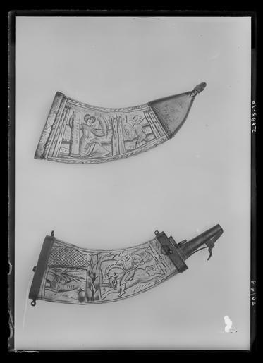 Keywords: Kruthorn - Livrustkammaren - 68950.tif LSH artwork sv Kruthorn av gulvitt plattpressat horn med graverad dekor på smalsidorna enkla flätband på baksidan tre fält med koncentriska cirklar mot streckad bakgrund Framsidans två fält avdelas av streckade trädstammar I det v större fältet finns en sittande dam iförd 1530-tals dräkt med pipkrage h arm håller om en avbruten kolonn Beständighet med påskrift Fortitudo tapperhet ståndaktighet I h hand håller hon en plym lascivitas lättfärdighet Vid kolonnbasen årtal 1591 I h fält en mustaschprydd krigare med hjälm sköld och spjut Tolkning ståndaktigheten ger vika för lättfärdighet <br/><br/>Botten av stål med rak sarg två skruvhål Munstycke tillplattad kon av mässing tillsluten med platt träknopp med små vingar Två graverade bågar vid mynningen Sågtandad nederkant med punkter ränder och våglinje två skruvar Ciselerat BPS På baksidan 1812 På hornet märkning 5667 Munstycke + propp l 99 mm original caption kruthorn - LRK 2948 2993 3107 1591 g 300 size mm 207 170 38 LRK Samuel Jönsson place of origin original filename LN_B01768_004648 39568 inventory number LRK 2958 68950 CC0 Kruthorn - Livrustkammaren - 68950-negative tif Powder horns Media contributed by LSH unmatched objKeyword Media contributed by LSH 2013-10 |