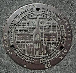 Keywords: Kumlokk Kristiansand.png Manhole cover from Kristiansand Norway My own photograph July 2006 2006-07-21 own assumed Ekko Structures in Kristiansand Manhole covers in Norway