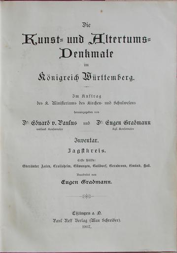 Keywords: Kunst Altertums Denkmale BW Titel.jpg de Eugen Gradmann Kunst und Altertums Denkmale Baden Württemberg Series title Dr Eduard v Paulus und Dr Eugen Gradmann 1907 Esslingen a N scan eines Buches aus Privatbesitz Kunst Altertums Denkmale BW Titel jpg PD-old-70-1923 Other versions German Wikisource books Kunst Altertums Denkmale BW |