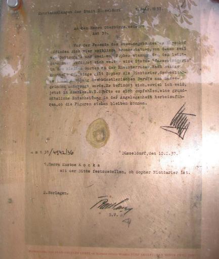 | Keywords: Kunstsammlung Düsseldorf, Brief an den Oberbürgermeister, Bronzestatuen Ehrenhof, 1937.jpg Brief ausgestellt im Ehrenhof Düsseldorf Untertitelt Reproduziert von Jean Jacques Lebel im Rahmen seines Werkes Fà NF SKULPTUREN MINUS Zwei 2001 Kunstsammlungen der Stadt Düsseldorf 5 Febr 1937 Febr durchgestrichen An den Herrn Oberbürgermeister Amt 31 Vor der Fassade des Museumsgebäudes am Ehrenhof befinden sich vier weibliche Bronzestatuen von denen zwei von Gottschalk und zwei von Sopher stammen Vom letztgenannten befindet sich weiter eine Statue Wasserträgerin in dem kleinen Garten an der Rheinterrasse Nach meiner Kenntnis der Dinge gilt Sopher als Nichtarier dem seinerzeit die Ausübung des künstlerischen Berufs aus Rassegründen untersagt wurde M E dürfte es sich empfehlen eine grundsätzliche Entscheidung in der Sache herbeizuführen ob die Figuren stehen bleiben können Unterschrift Amt 31/4542/36 Düsseldorf den 10 2 37 1 Herrn Kustos Kocks mit der Bitte festzustellen ob Sopher Nichtarier ist 2 Vorlegen Unterschriften B V M own photo 1937-02-10 Kunstsammlungen der Stadt Düsseldorf Kürschner PD-text Fünf Figuren minus zwei Jean-Jacques Lebel Racism in Nazi Germany Documents of Düsseldorf |