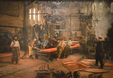 | Keywords: Kupferwalzwerk bei laufendem Betrieb (1891).jpg en An 1891 painting of the Heckmann coppermill by unknown artist at the Deutsches Historisches Museum Berlin In 1837 Carl Justus Heckmann 1786-1878 founded a copper mill at Schlesisches Tor Berlin Between 1840-1850 it was a leading company with numerous branches in the German Reich In 1868 Heckmann retired from business and his sons continued the company The painting was a gift to the foreman C W Meyer who can be seen on the right edge 1891 own Illustratedjc other versions pd-old cc-by-sa-4 0 Uploaded with UploadWizard Paintings in the Deutsches Historisches Museum Deutsches Historisches Museum - 19th century Copper mills 1890s paintings in Germany 1891 paintings |