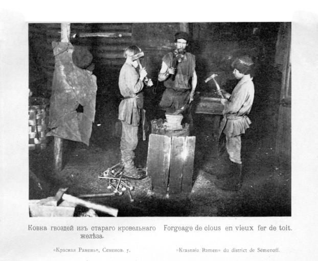 Keywords: Kustari 018 Kovka gvozsdej.jpg en Handicraft Industry and Trades of Nizhegorodskaja gubernija Krasnaja Ramen XIX c ru Куста ные п омыслы и емёсла ижего одской губе нии Ковка гвоздей из ста ого к овельного железа Де евня К асная Рамень Семёновского уезда 1896 год Скани ован из книги ижего одская губе ния по исследованиям губе нского земства Выпуск II Куста ные п омыслы ижего одской губе нии / сост А Плотников СПб 1896 еизвестный фотог аф конца XIX века 1896 PD-old Handicraft Industry of Nizhny Novgorod province |
