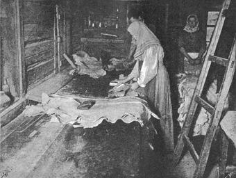 | Keywords: Kustari 070 Otdelka belogo opojka.jpg en Handicraft Industry and Trades of Nizhegorodskaja gubernija Katunki XIX c ru Куста ные п омыслы и емёсла ижего одской губе нии Отделка белого опойка Село Катунки Балахнинского уезда 1896 год Tannage de peaux de veau menues Village de Katounki du district de Balachna Скани ован из книги ижего одская губе ния по исследованиям губе нского земства Выпуск II Куста ные п омыслы ижего одской губе нии / сост А Плотников СПб 1896 еизвестный фотог аф конца XIX века 1896 PD-old thumb Handicraft Industry of Nizhny Novgorod province Skinners Tanners Black and white photographs of people at work |