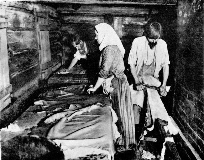 Keywords: Kustari 089 Otdelka belogo opojka.jpg en Handicraft Industry and Trades of Nizhegorodskaja gubernija Katunki XIX c Куста ные п омыслы и емёсла ижего одской губе нии Отделка белого опойка Село Катунки Балахнинского уезда 1896 год Tannage de peaux de veau menues Village de Katounki du district de Balachna Скани ован из книги ижего одская губе ния по исследованиям губе нского земства Выпуск II Куста ные п омыслы ижего одской губе нии / сост А Плотников СПб 1896 еизвестный фотог аф конца XIX века Типо-лит и фототипия П И Бабкина в Санкт-Пете бу ге 1896 PD-old thumb Handicraft Industry of Nizhny Novgorod province Tanners Skinners Black and white photographs of people at work Leather working tools |