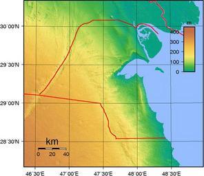 Keywords: Kuwait Topography.png Topographic map of Kuwait Created with GMT from SRTM data Own 2007-07-08 Sadalmelik Topographic maps of Kuwait