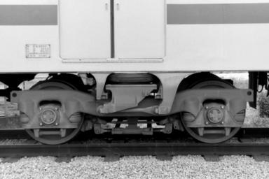 Keywords: KW-9 bogie truck on Nishitetsu 2000.jpg en KW-9 bogie truck on Nishitetsu 2000 ja 西鉄2000形のKW-9台車 1989-08-02 own Hahifuheho other versions cc-zero Nishitetsu 2000 series Bogie trucks by Kawasaki Heavy Industries Black and white photographs of trains in Japan 1989 in rail transport in Japan