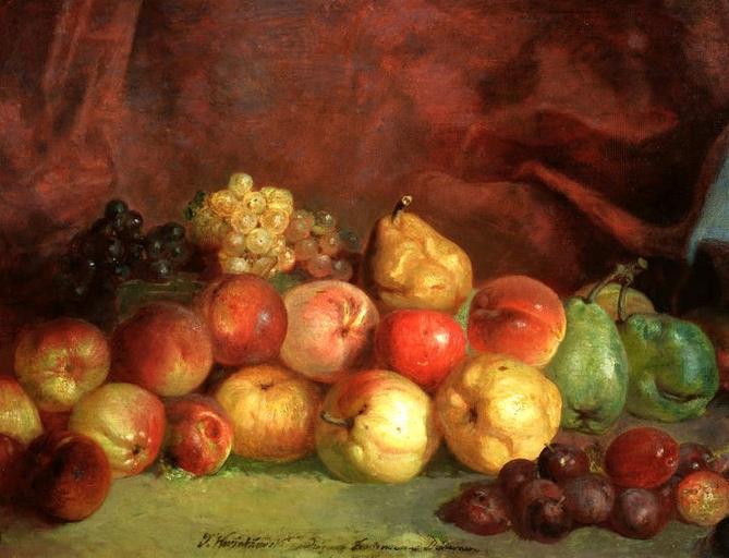 | Keywords: Kwiatkowski Fruits.jpg Artwork Creator Teofil Kwiatkowski 1888 oil canvas cm 48 64 Institution National Museum Warsaw Not on view accession number MP 321 object history credit line T Kwiatkowski wdzięczny Doktorowi / 1888 signature/date http //cyfrowe mnw art pl/dmuseion/docmetadata id 4721 cyfrowe mnw art pl See below PD-old-100 DEFAULTSORT 1888; Fruits Teofil Kwiatkowski 1888 paintings 1880s still-life paintings Kwiatkowski Paintings by Teofil Kwiatkowski in the National Museum in Warsaw 19th-century still life paintings of fruits Kwiatkowski |