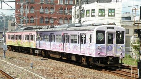 Keywords: L25 Mc105-515.jpg JR West Kumoha 105-515 and Kuha 105-5 ECs in Man-yo no Shikisai decoration 万葉の四季彩ラッピングが施されているJR西日 のクモハ105-515+クハ105-5 Own L25 203 l03 26 2010-08-11 JNR 105 Trains of Wakayama Line 2010 in rail transport in Japan