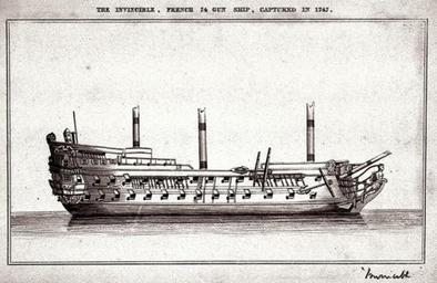 | Keywords: L Invincible vaisseau de 74 canons capture en 1747.jpeg en Flying the Invincible captured at the Battle of Cape Ortegal may 1747 This 74-gun is then inserted into the Royal Navy It is also copied by the shipyards English because it is more modern than the English ships of the same type fr Vaisseau lInvincible capturé en 1747 à la bataille du Cap Ortégal mai 1747 Ce navire de 74 canons est ensuite intégré à la Royal Navy Il est aussi copié par les chantiers navals anglais car il est plus moderne que les vaisseaux anglais du même type nmm ac uk Charnock John circa 1747 1748 Best quality PD-old Wars of France Ships of the line of France History of the Royal Navy History of the French Navy |