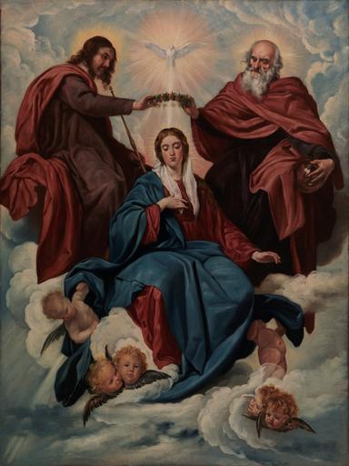| Keywords: La Coronación de la Virgen (Museo del Prado).jpg La obra representa la coronación de la Virgen María por los tres miembros de la Santísima Trinidad y es una copia del cuadro homónimo de Diego Velázquez que también se conserva en el Museo del Prado Siglo XVIII o XIX oil on canvas Size cm 126 167 Institution Museo del Prado Depositado en el Convento de San Pascual de Madrid https //www museodelprado es/coleccion/obra-de-arte/la-coronacion-de-la-virgen/4b99fb73-1e6e-4119-82d4-8317a7de32a7 accession number P03527 https //content cdnprado net/imagenes/Documentos/imgsem/4b/4b99/4b99fb73-1e6e-4119-82d4-8317a7de32a7/1fb0ac31-0a30-4dc8-840a-a6730e0088fb jpg PD-old-100 Paintings of the Coronation of Mary in Spain 18th-century paintings of Coronation of Mary 19th-century paintings of Coronation of Mary Paintings after Diego Velázquez Spanish 18th-century paintings in the Museo del Prado Spanish 19th-century paintings in the Museo del Prado Coronation of the Virgin Velázquez Iglesia y Convento de San Pascual Madrid |