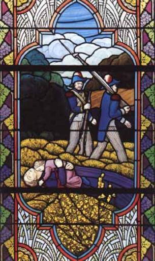 | Keywords: La Salle-de-Vihiers.jpg en Stained-glass window of the Saint-Martin church in La Salle-de-Vihiers represinting two French republican soldiers fleeing the crime scene after havind killed a Vendéan woman and wounded her small daugher the litte Jeanne Peneau fr Église de La-Salle-de-Vihiers Maine-et-Loire France Vitrerie de Desjardins entre 1931 et 1939 Le 4 avril 1794 deux soldats républicains s'éloignent après avoir blessé dans le champ de Beauchène la petite Jeanne Peneau et tué sa mère http //www loire-france com/histoire/guerres-vendee/vitraux/galerie/pages/vitrail-097 htm R Desjardins 1931 PD-old La Salle-de-Vihiers Stained glass windows in Maine-et-Loire Colonnes infernales War of Vendée on stained glass windows Jeanne Peneau 1931 stained glass windows |