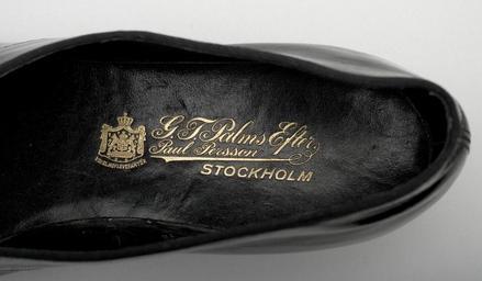 Keywords: Lacksko, insida - Livrustkammaren - 74797.tif Modellen är skuren i tre delar Bakstycket har sytts samman med dubbel söm mitt bak och förenas med ovanlädret med sidsöm <br/>Skon fodrad med svart kalvskinn likaså innersulan En extra svart sula finns skons bakre del <br/>Ringningen kantad med ett 5 mm brett svart ripsband Framtill i ringningen finns en platt 80 mm bred dubbelrosett av svart ripsband bredd 35 mm <br/>Innersulan märkt med i guldskrift KUNGL HOFLEVERANTÖR // G T Palms Efter // Paul Persson // STOCKHOLM <br/><br/>Yttersula är i frampartiet av ljusbrunt nötläder och sulan i hålfoten av svartfärgat nötläder som längs ytterkanterna har en dekorsöm <br/>Sulorna sammanfogade med en dekorsöm <br/>Den svarta träklacken har en stiftlapp av nötläder fastsatt med 44 trästift original caption Lacksko insida LRK 27509 <br/> Nyckelord Märke Sula Svart Föremålsbild Sko Herrmode Detalj early other date century 20 size mm 280 size mm 89 sula size mm 25 klack size mm 57 klack g 250 LRK Gustaf V av Sverige Skor ger mer - makt flärd magi 2007 Manligt Ur Gustaf V s garderob 2011-2012 Livrustkammaren place of origin original filename lm_dig2262_27509 64103 inventory number LRK 27509 74797 CC-BY-SA Göran Schmidt <gallery caption Different images of same object > File Lackpumps - Livrustkammaren - 57674 tif File Lacksko - Livrustkammaren - 66235 tif </gallery> Göran Schmidt Black shoes Footwear in Livrustkammaren Fashion Male clothing Shoes Media contributed by LSH unmatched material Media contributed by LSH dim-with multiple size templates Media contributed by LSH unmatched keyword Color images from Livrustkammaren Close-ups of shoes Media contributed by LSH 2013-10 |