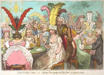 | Keywords: Lady-Godinas-Route-Gillray.jpeg Lady Godina's Rout; ”or ”Peeping-Tom spying out Pope-Joan Js Gy d et f SUMMARY A fashionable crowd playing cards at two tables In the foreground four people playing the game Pope-Joan One of the women is wearing a loose fitting semi-transparent dress with her breasts exposed Behind her peering down her dress is a man who is about to cut off a candle due to his distracted state Rear view of a fat woman dominates the left side of the picture MEDIUM 1 print etching hand-colored CREATED/PUBLISHED London H Humphrey 1796 March 12th According to the National Portrait Gallery of the UK the caricature refers to Lady Georgiana Gordon 1781 “1853 Duchess of Bedford from 1803 until her death; the title and the lecherous servant refer to Lady Godiva Pope-Joan is a card game; Lady Godina is holding the diamond nine which is called the Pope in that game The man sitting on Lady Godina 's right is John Sneyd 1763 “1835 ; the fat woman sitting on her left is Albinia Countess of Buckinghamshire died 1816 Library of Congress Prints Photographs Division LC-USZC4-8764 color film copy transparency http //memory loc gov/master/pnp/cph/3g00000/3g08000/3g08700/3g08764u tif uncompressed archival TIFF version 49 MB color level pick white point cropped and converted to JPEG quality level 88 with the GIMP 2 4 5 1796-03-12 creator James Gillray No known restriction on publication File Lady Godina's rout; - or - Peeping-Tom spying out Pope-Joan by James Gillray jpg LOC-image cph 3g08764 PD-old-100 James Gillray 1796 cartoons Caricatures of the United Kingdom Card games in art Georgina Gordon Duchess of Bedford Servants in art People with candles in art Décolleté in art Feathers in art 18th-century art Men and women in art Fashion in 1796 Voyeurism in art Sitting females in art |