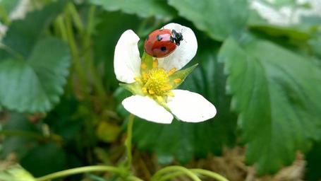 Keywords: ladybug strawberry green insect macro garden spring happiness flower red nature