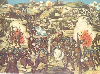 | Keywords: Lahanas1913.jpg  en Greek lithograph of the battle of Lachanas Second Balkan War 1913 el Λαϊκή λιθογραφία της  άχης του Κιλκίς 1913 Αθήνα Εθνικό και Ιστορικό  ουσείο/Athens National and Historical Museum Creator Sotirios Christidis 1913 Ιστορία του Ελληνικού Έθνους Εκδοτική Αθηνών Αθήνα 1980 Τόμος ΙΔ' σελ 341 Battle of Kilkis Lahanas Lithographs of Greece Sotirios Christidis PD-old  |