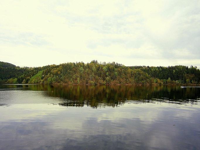 Keywords: lake landscape nature trees mirroring reflection natural water clouds mood atmosphere forest scenic background sky idyll overview view outlook