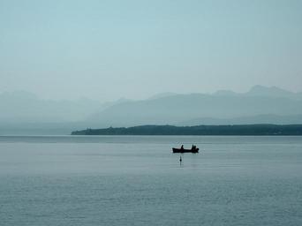 Keywords: lake mountains boat fishermen mountain lake nature landscape sky blue view panorama scenic relaxation natural destination idyllic lakeside