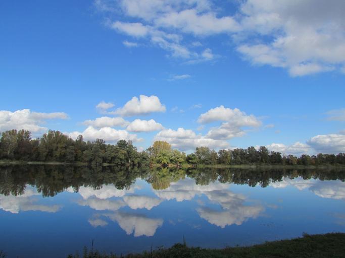 Keywords: lake nature water blue trees landscape waters mirroring clouds sky badesee rest mood still water being alone quiet idyll loneliness silent pond reflections
