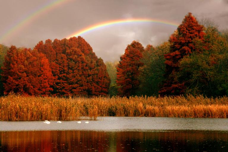 Keywords: lake rainbow trees red swans landscape autumn coloring