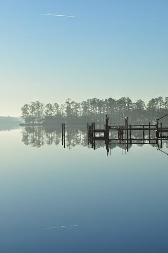 Keywords: lake reflection north carolina river water scenic fog blue sky calm